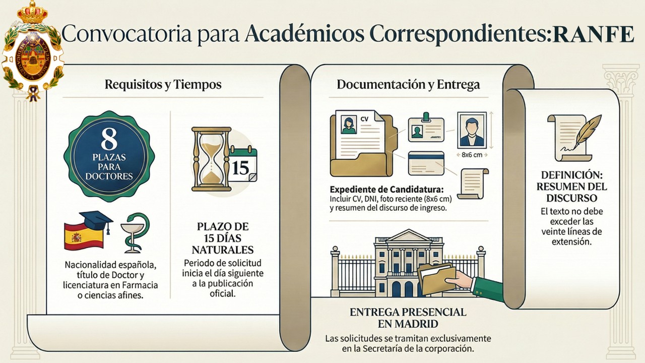 La solicitud podrá tramitarse conforme al modelo oficial facilitado por la Academia, y la presentación de candidaturas se realizará en la Secretaría de la corporación, en Madrid, según establece la resolución publicada. La convocatoria refuerza la labor científica, académica y corporativa de la institución en el ámbito de las ciencias farmacéuticas.