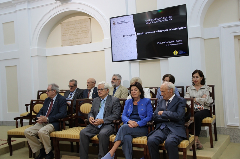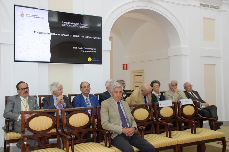 Tras unas ideas generales sobre la formación del cartílago y la articulación de rodilla, el Excmo. Sr. D. Pedro Guillén García abordó las particulares características inmunológicas del cartílago, derivadas de su carencia de vasos, nervios y drenaje linfático. Analizó la estructura del cartílago hialino articular y su actividad a lo largo de la vida humana y presentó datos sobre su grosor, tanto en humanos como en animales de experimentación.