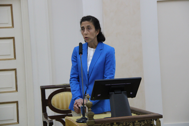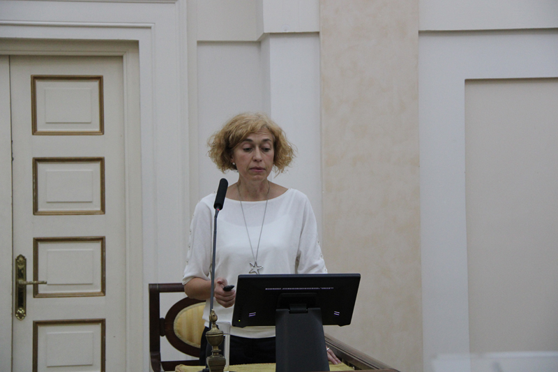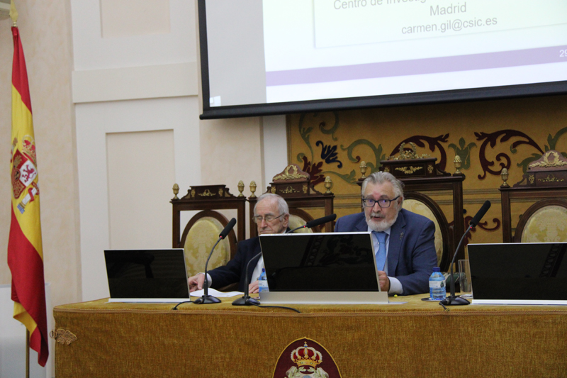 La Dra. Carmen Gil trató sobre la “Búsqueda de nuevos fármacos leishmanicidas: aproximaciones basadas en la diana”. Tras una primera aproximación a esta enfermedad parasitaria, a su epidemiología y a su ciclo vital, pasó a ocuparse de los tratamientos habituales y los problemas que subyacen en estos: resistencias, toxicidades, incluso teratogenias; contrariedades que obligan a la búsqueda de nuevos compuestos. Las investigaciones actuales emplean dos estrategias complementarias: bien una aproximación fenotípica, bien un acercamiento basado en la diana. Su disertación se basó en las experiencias de esta segunda opción, a través de la búsqueda de inhibidores de fosfodiesterasas y protein-quinasas de Leishmania como dianas terapéuticas. Señaló los procesos de selección de moléculas a través de su cribado in vitro; su caracterización metabólica; la realización de pruebas de eficacia in vivo y el estudio del modo de unión con la estructura molecular de la fosfodiesterasa de Leishmania. Estos estudios aumentan la diversidad química de los inhibidores de fosfodiesterasas y protein-quinasas como posibles candidatos a fármacos y establecen que la combinación de cribados enfocados con dianas, junto a la realización de cribados fenotípicos, aumenta la identificación de nuevos compuestos con gran potencial para el desarrollo de fármacos leishmanicidas.