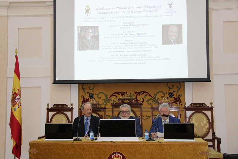 El jueves 5 de octubre de 2023 a las 19 horas, la Real Academia Nacional de Farmacia y la Fundación José Casares Gil de amigos de la RANF celebraron la Jornada Científica organizada por la sección 4ª de Farmacología y Farmacoterapia, coordinada por el Excmo. Sr. D. Juan Tamargo y en la que intervinieron como ponentes el Prof. Dr. Fernando Rodríguez Artalejo, Catedrático y Director del Departamento de Medicina Preventiva, Salud Pública y Microbiología de la Facultad de Medicina de la UAM, quien nos habló sobre “Dieta mediterránea y envejecimiento saludable“ y el Prof. Dr. José López-Sendón Hentschel, Profesor Emérito de Cardiología de la Facultad de Medicina de la UAM. Director Científico del Instituto de Investigación IdiPaz. Hospital Universitario La Paz de Madrid, quien trató el tema “Ensayos clínicos. Luces y sombras”.