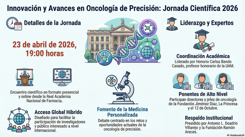 La Real Academia Nacional de Farmacia de España acogerá el jueves 23 de abril de 2026, a las 19:00 horas, la jornada científica “Innovación y avances en oncología de precisión”, una cita centrada en uno de los ámbitos más dinámicos de la medicina actual. El encuentro se celebrará en formato presencial y online, con el objetivo de facilitar la participación de profesionales, investigadores y público interesado en los nuevos desarrollos de la oncología personalizada.