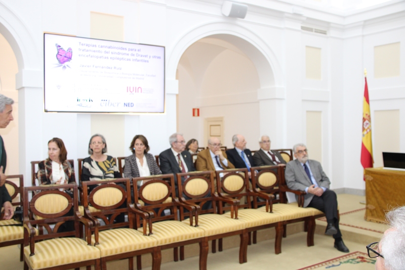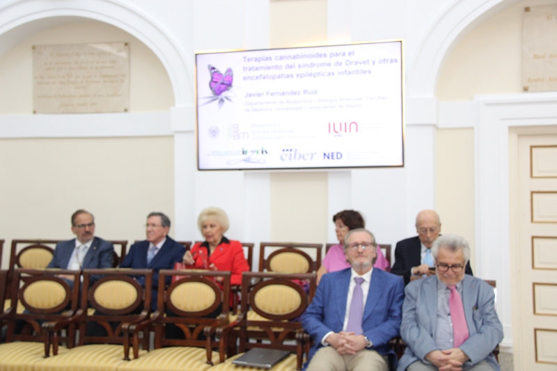 El primero en intervenir fue José Javier Fernández Ruiz, catedrático de Bioquímica y Biología Molecular de la Universidad Complutense de Madrid, quien expuso los avances en el desarrollo de terapias cannabinoides para el tratamiento del síndrome de Dravet y otras encefalopatías epilépticas infantiles. El ponente explicó cómo el cannabidiol (CBD), componente de la Cannabis Sativa, impulsó a la compañía británica GW Pharmaceuticals —actualmente Jazz Pharmaceuticals— a desarrollar el fármaco Epidiolex, que obtuvo la designación huérfana por la FDA y la EMA en 2013 y la aprobación definitiva tras ensayos clínicos controlados en 2018 por la FDA y en 2019 por la EMA, para el tratamiento de las convulsiones asociadas al síndrome de Dravet, el síndrome de Lennox-Gastaut y otras encefalopatías epilépticas infantiles. Fernández Ruiz subrayó que el Epidiolex ha demostrado también potencial como modificador de la progresión de la enfermedad en patologías neurodegenerativas, gracias a sus efectos antiinflamatorios, antioxidantes y citoprotectores. Durante los últimos cinco años, su grupo de investigación ha llevado a cabo estudios preclínicos con este fármaco y con el terpeno β-cariofileno en un modelo experimental de síndrome de Dravet en ratones, observando importantes beneficios frente a la hiperactividad motora, los rasgos autistas y otras comorbilidades, especialmente cuando se combinaron ambos compuestos. El equipo también identificó los mecanismos neuropatológicos y las áreas del sistema nervioso central implicadas en dichos efectos beneficiosos.