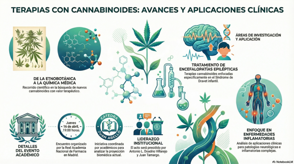 La Real Academia Nacional de Farmacia de España celebrará el jueves 16 de abril, a las 19:00 horas, una mesa redonda en el marco de la Cátedra Juan Abelló, dedicada a uno de los campos de mayor proyección biomédica actual: el desarrollo de terapias basadas en cannabinoides. La iniciativa reunirá a expertos de reconocido prestigio para analizar avances científicos y aplicaciones clínicas en enfermedades neurológicas e inflamatorias.