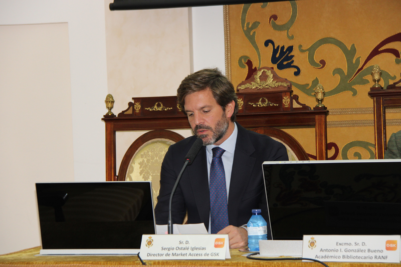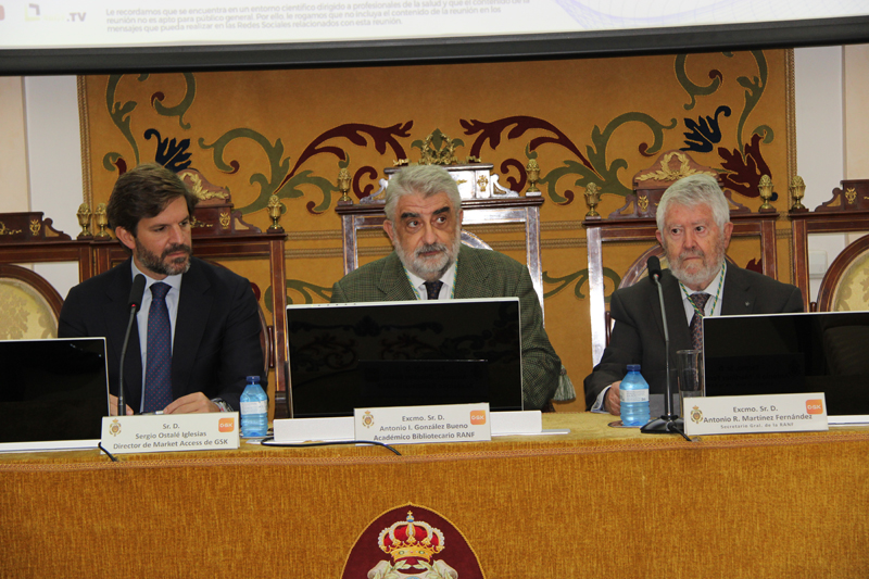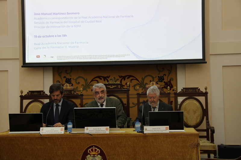 La apertura del acto corrió a cargo del Excmo. Sr. D. Antonio I. González Bueno, académico bibliotecario de la RANF; tras unas palabras de presentación pronunciadas por D. Sergio Ostalé, Market Access Director GSK, intervino la Excma. Sra. Dª. María Molina Martín, directora de la Cátedra GSK de Innovación Farmacéutica, quien introdujo el tema y presentó al ponente, el Ilmo. Sr. D. José Manuel Martínez Sesmero.