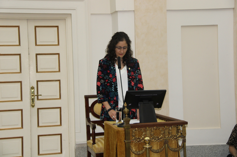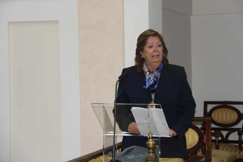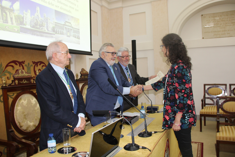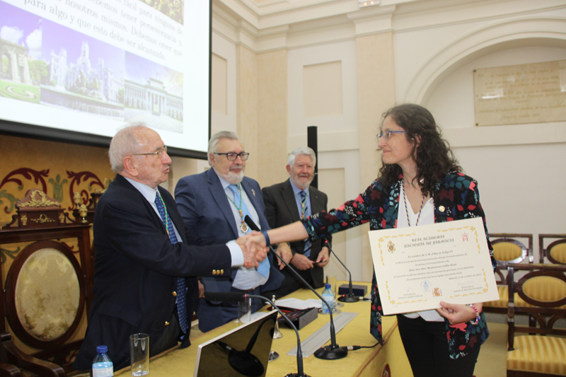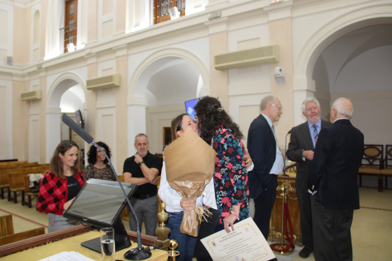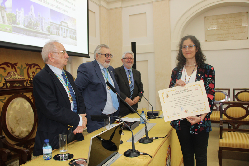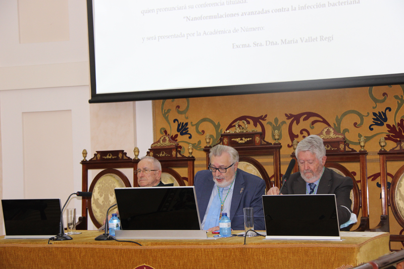 En su discurso, la Dra. Colilla expuso la problemática actual de las infecciones y el trabajo de investigación realizado para proponer soluciones a este problema de gran impacto socio-económico. Comenzó abordando la relación histórica de la Humanidad con las infecciones hasta el desarrollo de vacunas y antibióticos para abordar, a continuación, la resistencia a los fármacos antimcrobianos como una amenaza seria frente a los avances conseguidos en salud global, un problema que consideró complejo y mutifuncional, por lo que pasó a analizar los mecanismos de resistencia bacteriana, en particular las ‘super bacterias’ y la formación de biofilms bacterianos. El grueso de su intervención estuvo dedicado a las nanoformulaciones antibacterianas y a las ventajas que estas suponen para el transporte selectivo de antibacterianos a la diana terapéutica, la liberación controlada de fármacos, la posibilidad de incorporación conjunta de varios agentes microbianos, la mejora de la eficacia terapéutica, la reducción de dosis efectiva, la disminución significativa de efectos secundarios y, en definitiva, el aumento de la seguridad y de la biocompatibilidad. De entre los nanotransportadores disponibles, se ocupó de la utilidad de las nanopartículas mesoporosas de sílice, cuya utilidad señaló, a la par que dio noticia de su experiencia de empleo en cuatro frentes: sistemas liberalizadores de antibióticos (rifampicina, levofloxacino, gentamicina), incorporación de sistemas estímulo/repuesta que permiten una liberación inteligente de fármacos, incorporación de ligandos de vectorialziación para desarrollar nanosistemas con capacidad para dirigirse a la bacteria y/o al biofilm y el desarrollo de sistemas multiterapia mediante la combinación de diferentes agentes antimicrobianos como antibióticos y cationes terapéuticos (Ag+, Zn2+, Cu2+).