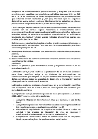 integradas en el ordenamiento jur%u00eddico europeo y aseguran que los datos precl%u00ednicos son trazables, reproducibles y auditables. Las gu%u00edas ICH y las GLP de la OCDE se relacionan de forma complementaria: las primeras definen qu%u00e9 estudios deben realizarse y por qu%u00e9, mientras que las segundas determinan c%u00f3mo deben realizarse t%u00e9cnicamente los estudios no cl%u00ednicos para que sean aceptables desde el punto de vista regulatorio.Las GLP exigen expl%u00edcitamente que los estudios con animales se realicen de acuerdo con las normas legales nacionales e internacionales sobre protecci%u00f3n animal. Debe haber una buena justificaci%u00f3n cient%u00edfica del uso de animales, deben de establecerse medidas que minimicen su sufrimiento (analgesia, anestesia%u2026) y deben usarse m%u00e9todos alternativos cuando sea posible (principio de las 3Rs)Es interesante la evoluci%u00f3n de estos estudios precl%u00ednicos dependientes de la experimentaci%u00f3n en animales. Cada vez m%u00e1s, la experimentaci%u00f3n precl%u00ednicaabraza los principios de 3R: a) Reemplazar el uso de animales por m%u00e9todos sin animales siempre que sea posible;si no es posible:b) Reducir el n%u00famero de animales al m%u00ednimo necesario para obtener resultados cient%u00edficamente v%u00e1lidos;y adem%u00e1s:c) Refinar las pr%u00e1cticas para minimizar el estr%u00e9s y mejorar el bienestar de los animales de estudio.La Directiva 2010/63/UE relativa a la protecci%u00f3n de los animales utilizados para fines cient%u00edficos exige a los titulares de autorizaciones de comercializaci%u00f3n que integren las 3R y las normas de bienestar para el trato de los animales en todos los aspectos del desarrollo, la fabricaci%u00f3n y controly la experimentaci%u00f3n de medicamentos.La Directiva pretende proteger a los animales en la investigaci%u00f3n cient%u00edfica, con el objetivo final de sustituir toda la investigaci%u00f3n con animales por m%u00e9todos sin animales.El programa de trabajo para la integraci%u00f3n de estos principios en la UE desde 2025 a 2027 incluye, entre otras acciones: %u2022 Apoyar la integraci%u00f3n de m%u00e9todos in s%u00edlico (por ejemplo, el uso de Big Data)%u2022 Apoyar la integraci%u00f3n de herramientas basadas en inteligencia artificial (IA) relacionados con la evaluaci%u00f3n no cl%u00ednica y las 3R %u2022 Garantizar el seguimiento de la aplicaci%u00f3n de las 3R en el control de calidad y las pruebas de liberaci%u00f3n de lotes de vacunas y medicamentos biotecnol%u00f3gicos humanos y veterinarios.%u2022 Cooperaci%u00f3n internacional sobre la armonizaci%u00f3n de los requisitos t%u00e9cnicos para el registro de medicamentos veterinarios.