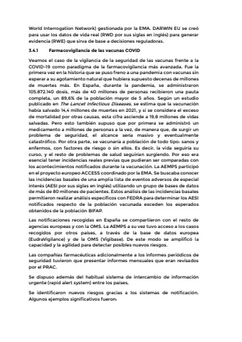 World Interrogation Network) gestionada por la EMA. DARWIN EU se cre%u00f3 para usar los datos de vida real (RWD por sus siglas en ingl%u00e9s) para generar evidencia (RWE) que sirva de base a decisiones reguladoras. 3.4.1 Farmacovigilancia de las vacunas COVIDVeamos el caso de la vigilancia de la seguridad de las vacunas frente a la COVID-19 como paradigma de la farmacovigilancia m%u00e1s avanzada. Fue la primera vez en la historia que se puso freno a una pandemia con vacunas sin esperar a su agotamiento natural que hubiera supuesto decenas de millones de muertes m%u00e1s. En Espa%u00f1a, durante la pandemia, se administraron 105.872.140 dosis, m%u00e1s de 40 millones de personas recibieron una pauta completa, un 89,6% de la poblaci%u00f3n mayor de 5 a%u00f1os. Seg%u00fan un estudio publicado en The Lancet Infectious Diseases, se estima que la vacunaci%u00f3n hab%u00eda salvado 14,4 millones de muertes en 2021, y si se considera el exceso de mortalidad por otras causas, esta cifra asciende a 19,8 millones de vidas salvadas. Pero esto tambi%u00e9n supuso que por primera se administr%u00f3 un medicamento a millones de personas a la vez, de manera que, de surgir un problema de seguridad, el alcance ser%u00eda masivo y eventualmente catastr%u00f3fico. Por otra parte, se vacunar%u00eda a poblaci%u00f3n de todo tipo: sanos y enfermos, con factores de riesgo o sin ellos. Es decir, la vida seguir%u00eda su curso, y el resto de problemas de salud seguir%u00edan surgiendo. Por eso era esencial tener incidencias reales previas que pudieran ser comparadas con los acontecimientos notificados durante la vacunaci%u00f3n. La AEMPS particip%u00f3 en el proyecto europeo ACCESS coordinado por la EMA. Se buscaba conocer las incidencias basales de una amplia lista de eventos adversos de especial inter%u00e9s (AESI por sus siglas en ingl%u00e9s) utilizando un grupo de bases de datos de m%u00e1s de 80 millones de pacientes. Estos an%u00e1lisis de las incidencias basales permitieron realizar an%u00e1lisis espec%u00edficos con FEDRA para determinar los AESI notificados respecto de la poblaci%u00f3n vacunada exceden los esperados obtenidos de la poblaci%u00f3n BIFAP.Las notificaciones recogidas en Espa%u00f1a se compartieron con el resto de agencias europeas y con la OMS. La AEMPS a su vez tuvo acceso a los casos recogidos por otros pa%u00edses, a trav%u00e9s de la base de datos europea (EudraVigilance) y de la OMS (Vigibase). De este modo se amplific%u00f3 la capacidad y la agilidad para detectar posibles nuevos riesgos. Las compa%u00f1%u00edas farmac%u00e9uticas adicionalmente a los informes peri%u00f3dicos de seguridad tuvieron que presentar informes mensuales que eran revisados por el PRAC. Se dispuso adem%u00e1s del habitual sistema de intercambio de informaci%u00f3n urgente (rapid alert system) entre los pa%u00edses,Se identificaron nuevos riesgos gracias a los sistemas de notificaci%u00f3n. Algunos ejemplos significativos fueron: