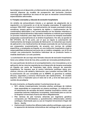 tecnol%u00f3gicos en el desarrollo y la fabricaci%u00f3n de medicamentos. para ello, es esencial disponer de modelo de prospecci%u00f3n del horizonte (horizon scanning) para identificar las %u00e1reas en las que se necesitan conocimientos especializados adicionales. 4.1 Terapias avanzadas y cl%u00e1usula de exclusi%u00f3n hospitalariaUn %u00e1mbito de extraordinario inter%u00e9s y un ejemplo de adaptaci%u00f3n de la regulaci%u00f3n a la innovaci%u00f3n es el de las terapias avanzadas. El reglamento europeo 1394/2007 regula los medicamentos de terapia avanzada (c%u00e9lulas som%u00e1ticas, terapia g%u00e9nica, ingenier%u00eda de tejidos o medicamentos de TA combinados) destinados a ser comercializados en los Estados miembros y preparados industrialmente o fabricados mediante un m%u00e9todo que implique un proceso industrial, pero deja fuera de su alcance las terapias avanzadas preparadas ocasionalmente en el %u00e1mbito hospitalario. Por ello, se aprob%u00f3 el RD 477/2014, de 13 de junio, por el que se regula la autorizaci%u00f3n de medicamentos de terapia avanzada de fabricaci%u00f3n no industrial, que resulta de aplicaci%u00f3n a los medicamentos de terapia avanzada de uso humano que son preparados ocasionalmente, de acuerdo con normas de calidad espec%u00edficas, y empleados en Espa%u00f1a, en una instituci%u00f3n hospitalaria y bajo la responsabilidad profesional exclusiva de un m%u00e9dico colegiado, con el fin de cumplir una prescripci%u00f3n facultativa individual de un producto hecho a medida destinado a un solo paciente. La autorizaci%u00f3n de uso bajo esta llamada cl%u00e1usula de exclusi%u00f3n hospitalaria tiene una validez inicial de tres a%u00f1os y podr%u00e1 ser renovada peri%u00f3dicamenteUn caso particular de %u00e9xito en el acompa%u00f1amiento a los innovadores y en la aplicaci%u00f3n de las ciencias regulatorias es el desarrollo de terapias avanzadas en Espa%u00f1a por parte de hospitales bajo dicha cl%u00e1usula de exenci%u00f3n hospitalaria. Se requiere que el centro solicitante justifique datos precl%u00ednicos, cl%u00ednicos y de calidad y fabricaci%u00f3n, que cumplan normas GMP. Con la autorizaci%u00f3n de uso concedida por la AEMPS, se garantiza la calidad, eficacia, seguridad y correcta informaci%u00f3n del medicamento. El modelo espa%u00f1ol, %u00fanico e inspirador para el resto de la UE, y sirve de base para un cambio de paradigmaEn este momento, en Espa%u00f1a existen 5 autorizaciones de uso:%u2022 NC1: c%u00e9lulas mesenquimales troncales adultas aut%u00f3logas de m%u00e9dula %u00f3sea expandidas en suspensi%u00f3n en plasma aut%u00f3logo. La indicaci%u00f3n es el tratamiento de secuelas de lesi%u00f3n medular traum%u00e1tica cr%u00f3nica, que presenten lesiones medulares incompletas. Autorizado para su uso en el Hospital Universitario Puerta de Hierro Majadahonda%u2022 Piel: l%u00e1minas de piel humana obtenida por ingenier%u00eda gen%u00e9tica compuesta por fibroblastos y queratinocitos diferenciados adultos aut%u00f3logos. Autorizado para su uso en Hospital Universitario Virgen del Rocio %u2013 Sevilla%u2022 Centromcell: Condrocitos diferenciados adultos aut%u00f3logos, para uso en la reparaci%u00f3n de lesiones sintom%u00e1ticas del cart%u00edlago de la rodilla (grado