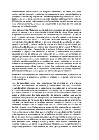 enfermedades devastadoras sin ninguna alternativa, es como un sue%u00f1o hecho realidad, pero a%u00fan queda camino que recorrer para mejorar la eficacia y asegurar su calidad y seguridad. La tecnolog%u00eda precisa y correctiva CRISPRCas9, es decir, la edici%u00f3n de bases puede abordar potencialmente m%u00e1s del 90% de las variantes pat%u00f3genas en enfermedades gen%u00e9ticas que, aunque raras individualmente, afectan colectivamente a cientos de millones de personas en todo el mundo.Hace solo un mes, Musunuru y cols. publicaron un caso de edici%u00f3n g%u00e9nica in vivo a un neonato en el Hospital de Philadelphia de ni%u00f1os. El paciente se diagnostic%u00f3 al nacer de deficiencia de carbamoilfosfato sintetasa 1 (CPS1) un error cong%u00e9nito ultrarraro del metabolismo que afecta al ciclo de la urea. La deficiencia de CPS1 afecta a 1 de cada 1.300.000 personas y tiene una mortalidad estimada del 50% en la primera infancia. Desarrollaron un editor gen%u00e9tico espec%u00edfico para el paciente que se administr%u00f3 en nanopart%u00edculas lip%u00eddicas, K-ABE. El paciente recibi%u00f3 dos infusiones de la terapia K-ABE a los 7 y 8 meses de edad. Despu%u00e9s de la primera infusi%u00f3n, el paciente pudo aumentar la ingesta de prote%u00ednas y reducir la medicaci%u00f3n sin eventos adversos graves. Se observ%u00f3 una reducci%u00f3n en los niveles de amon%u00edaco en sangre y glutamina tras el tratamiento. La terapia fue aprobada por la FDA bajo un protocolo de acceso expandido para un solo paciente. Se hab%u00edan realizado estudios precl%u00ednicos en modelos de rat%u00f3n y primates no humanos para evaluar su seguridad y eficacia. Ya hemos visto que lo que es activo no es necesariamente eficaz; que no todos los medicamentos eficaces son seguros; que la calidad de la fabricaci%u00f3n condiciona la eficacia y seguridad del medicamento, por tanto, queda un camino largo por recorrer. Acercarse a las fronteras del conocimiento es emocionante, convertirlo en medicamentos o productos sanitarios eficaces y seguros, una enorme responsabilidad.Nos da seguridad saber que afrontamos los desaf%u00edos de una manera colectiva, aprovechando el talento y compromiso de una comunidad reguladora bien integrada en el ecosistema innovador, con la certeza de que el conocimiento se expande cuando se comparte y que no hay mayor honor que poner remedio al sufrimiento que causan las enfermedades con nuestro saber y dedicaci%u00f3n. En esta vocaci%u00f3n de servicio p%u00fablico nos vemos acompa%u00f1ados por nuestros compa%u00f1eros en el Ministerio de Sanidad y pornuestros colegas de Farmacia de la Defensa; hemos pasado por momentos dif%u00edciles que resultaron abordables porque trabajamos unidos y porque contamos siempre con la implicaci%u00f3n de los Secretarios de Estado de Sanidad, los doctores Silvia Calz%u00f3n y Javier Padilla, y la confianza y respaldo de los sucesivos Ministro y Ministras de Sanidad hasta la actual, la doctora M%u00f3nica Garcia. A todos ellos quiero mostrar mi agradecimiento. Tambi%u00e9n quiero agradecer a quienes me han ense%u00f1ado e iniciado en el conocimientode las ciencias farmac%u00e9uticas, se%u00f1alando particularmente a mis profesores que fueron o son acad%u00e9micos de esta casa: los profesores Jos%u00e9 Luis Vila Jato, Jos%u00e9 Mi%u00f1ones Trillo, Enrique Ravi%u00f1a y Mar%u00eda Jos%u00e9 Alonso, referente por muchos motivos; as%u00ed como los profesores Mabel Loza y Angel Concheiro. Tengo muy presente a mi director de tesis, gu%u00eda y mentor de quien me