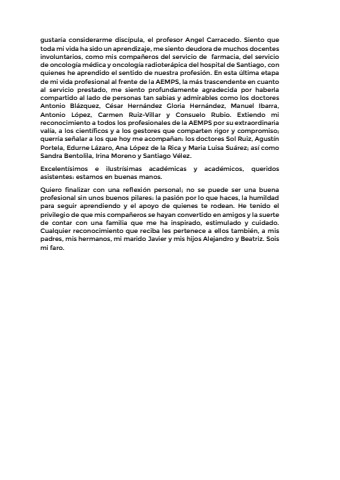 gustar%u00eda considerarme disc%u00edpula, el profesor Angel Carracedo. Siento que toda mi vida ha sido un aprendizaje, me siento deudora de muchos docentes involuntarios, como mis compa%u00f1eros del servicio de farmacia, del servicio de oncolog%u00eda m%u00e9dica y oncolog%u00eda radioter%u00e1pica del hospital de Santiago, con quienes he aprendido el sentido de nuestra profesi%u00f3n. En esta %u00faltima etapa de mi vida profesional al frente de la AEMPS, la m%u00e1s trascendente en cuanto al servicio prestado, me siento profundamente agradecida por haberla compartido al lado de personas tan sabias y admirables como los doctores Antonio Bl%u00e1zquez, C%u00e9sar Hern%u00e1ndez Gloria Hern%u00e1ndez, Manuel Ibarra, Antonio L%u00f3pez, Carmen Ruiz-Villar y Consuelo Rubio. Extiendo mi reconocimiento a todos los profesionales de la AEMPS por su extraordinaria val%u00eda, a los cient%u00edficos y a los gestores que comparten rigor y compromiso; querr%u00eda se%u00f1alar a los que hoy me acompa%u00f1an: los doctores Sol Ruiz, Agust%u00edn Portela, Edurne L%u00e1zaro, Ana L%u00f3pez de la Rica y Maria Luisa Su%u00e1rez; as%u00ed comoSandra Bentolila, Irina Moreno y Santiago V%u00e9lez.Excelent%u00edsimos e ilustr%u00edsimas acad%u00e9micas y acad%u00e9micos, queridos asistentes: estamos en buenas manos.Quiero finalizar con una reflexi%u00f3n personal; no se puede ser una buena profesional sin unos buenos pilares: la pasi%u00f3n por lo que haces, la humildad para seguir aprendiendo y el apoyo de quienes te rodean. He tenido el privilegio de que mis compa%u00f1eros se hayan convertido en amigos y la suerte de contar con una familia que me ha inspirado, estimulado y cuidado. Cualquier reconocimiento que reciba les pertenece a ellos tambi%u00e9n, a mis padres, mis hermanos, mi marido Javier y mis hijos Alejandro y Beatriz. Sois mi faro.