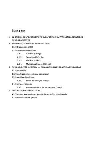 %u00cd N D I C E1. EL ORIGEN DE LAS AGENCIAS REGULATORIAS Y SU PAPEL EN LA SEGURIDADDE LOS PACIENTES2. ARMONIZACI%u00d3N REGULATORIA GLOBAL2.1. Introducci%u00f3n a ICH2.2. Principales Directrices2.2.1. Calidad (ICH Qx):2.2.2. Seguridad (ICH Sx)2.2.3. Eficacia (ICH Ex)2.2.4. Multidisciplinares (ICH Mx)3. DE LAS DIRECTRICES ICH a las GUIAS DE BUENAS PRACTICAS EUROPEAS3.1. Fabricaci%u00f3n3.2. Investigaci%u00f3n pre-cl%u00ednica-seguridad3.3. Investigaci%u00f3n cl%u00ednica3.3.1. Tipos de ensayos cl%u00ednicos3.4. Farmacovigilancia3.4.1. Farmacovilancia de las vacunas COVID4. REGULACI%u00d3N E INNOVACI%u00d3N %u20134.1. Terapias avanzadas y cl%u00e1usula de exclusi%u00f3n hospitalaria4.2. Futuro - Edici%u00f3n g%u00e9nica